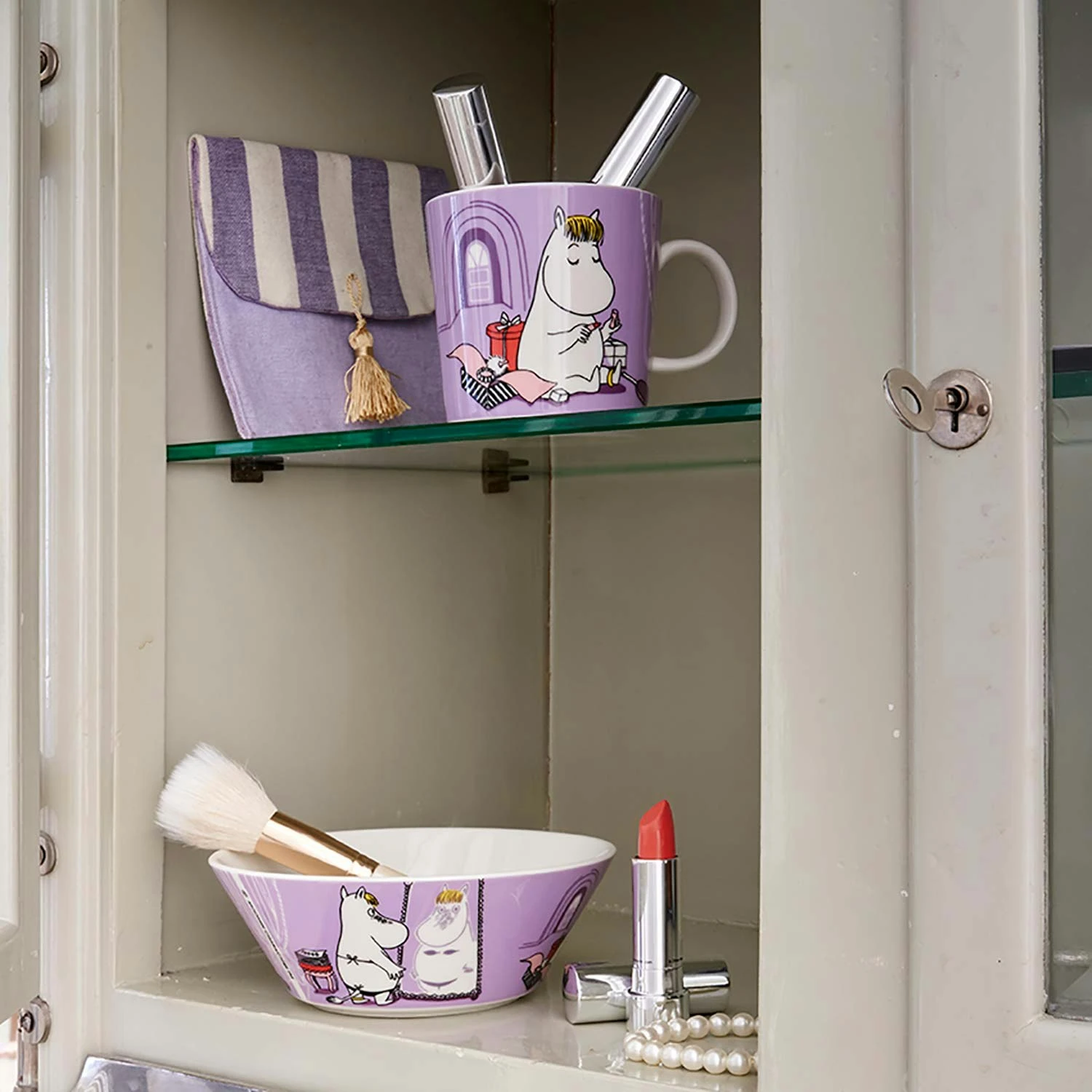 Die Mumin Tasse mit Snorkfräulein von Arabia ist mit einem Motiv aus dem klassischen Buch „Mumins an der Riviera“ aus dem Jahr 1955 geschmückt. Das Buch handelt von dem Urlaub der Mumin Familie an der Riviera, wo das Snorkfräulein im Casino Geld gewinnt. Für das Geld kauft sie einen schönen Bikini. Die Motive zeigen, wie sie ihren Bikini probiert und einen neuen Lippenstift testet. Die Originalzeichnungen stammen von Tove Jansson.